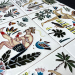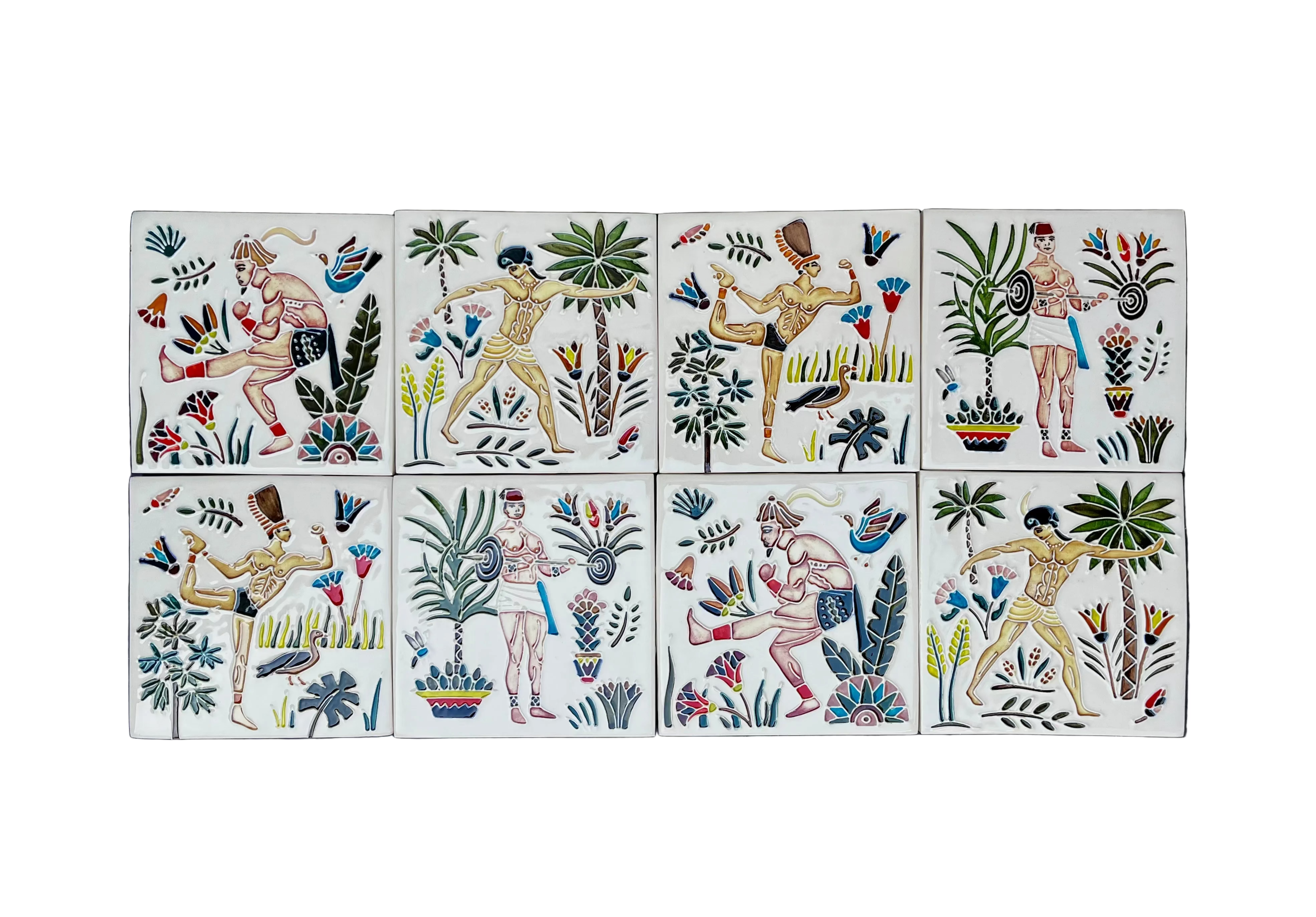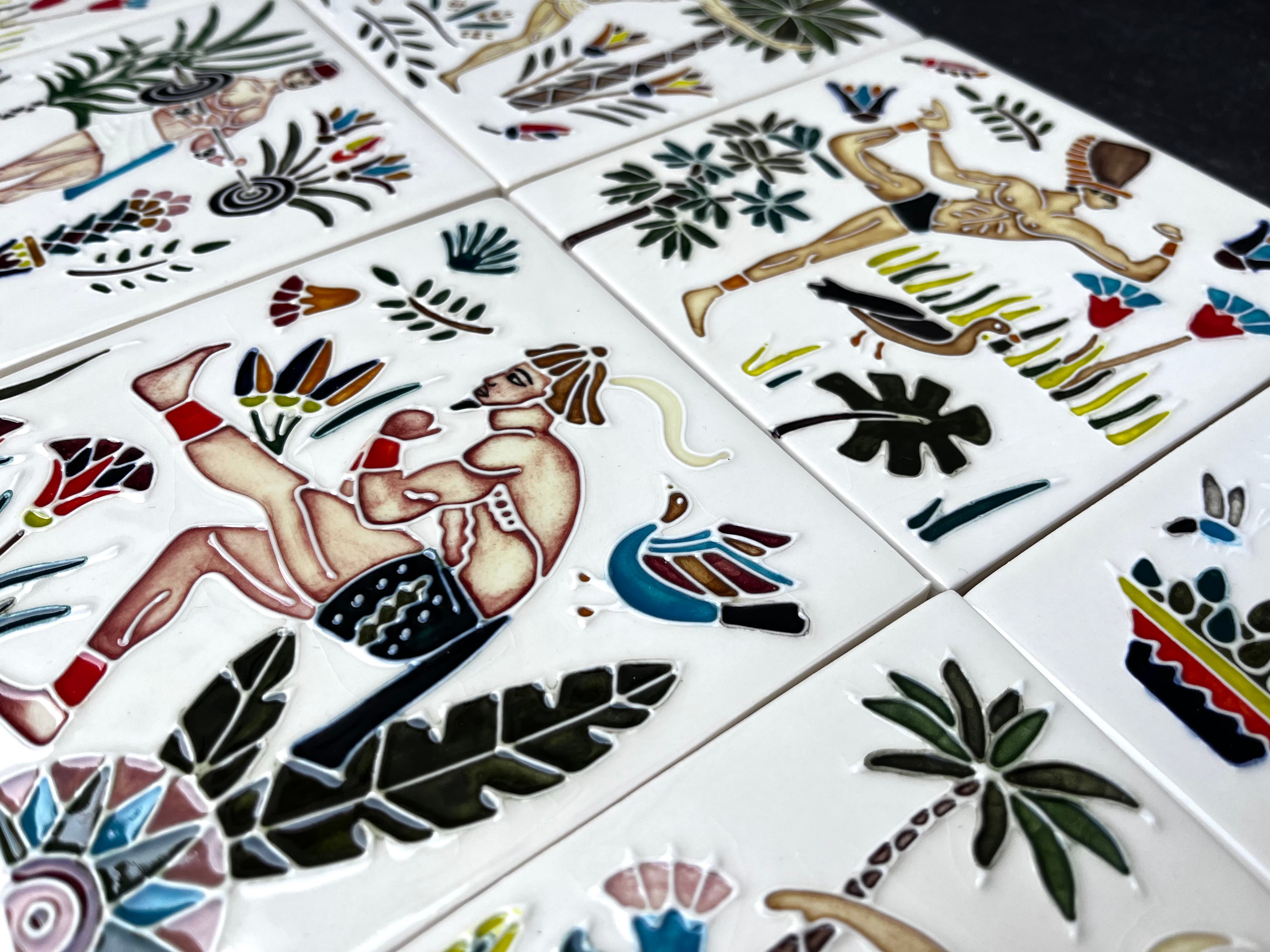 In this joyful collection of handpainted ceramic tiles, French artist Louis Barthélemy captures the energy and vivacity of contemporary Egypt while paying homage to its storied past. Inspired by the ancient frescos and hieroglyphics lining Egyptian temples and tombs, along with the work of contemporary French photographer Denis Dailleux, Barthélemy evokes fantastical scenes of elegant figures, frolicking animals and naturalist motifs. Handcrafted in England, using traditional tube lining techniques. Coordinating trims and tiles are available to order separately with no minimums. Please note, glaze colours will vary between batches.