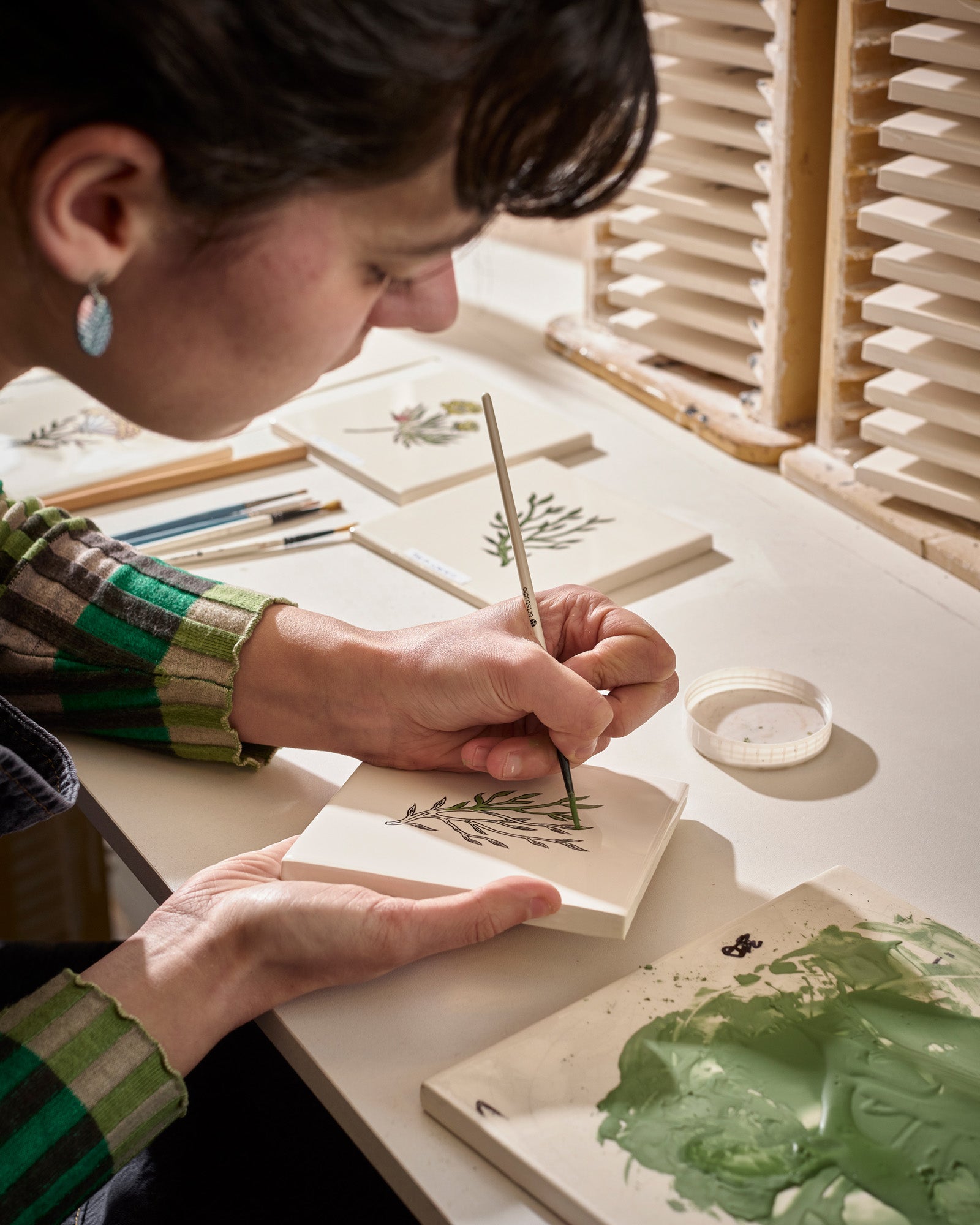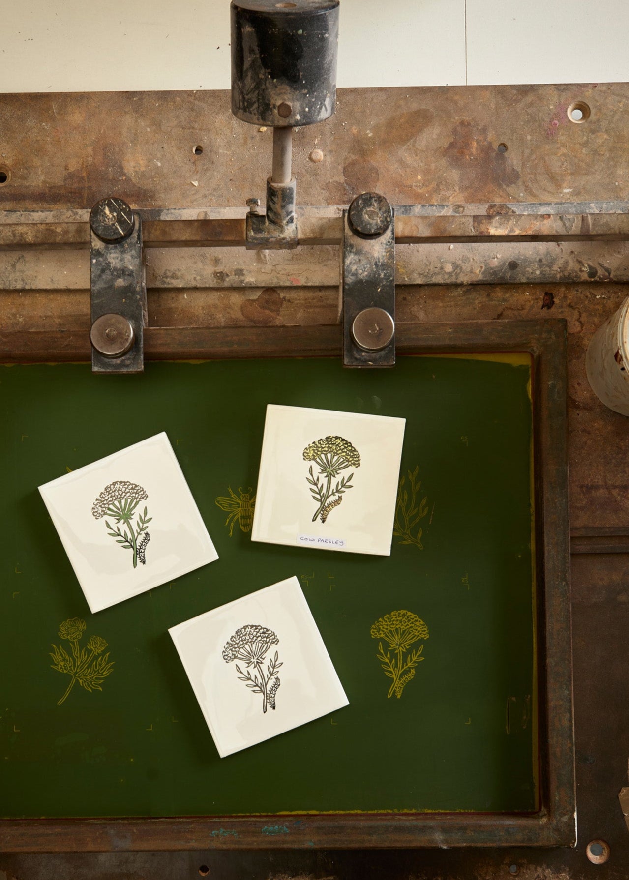 After being glazed and fired, each tile is screen printed with the black primary artwork outline.