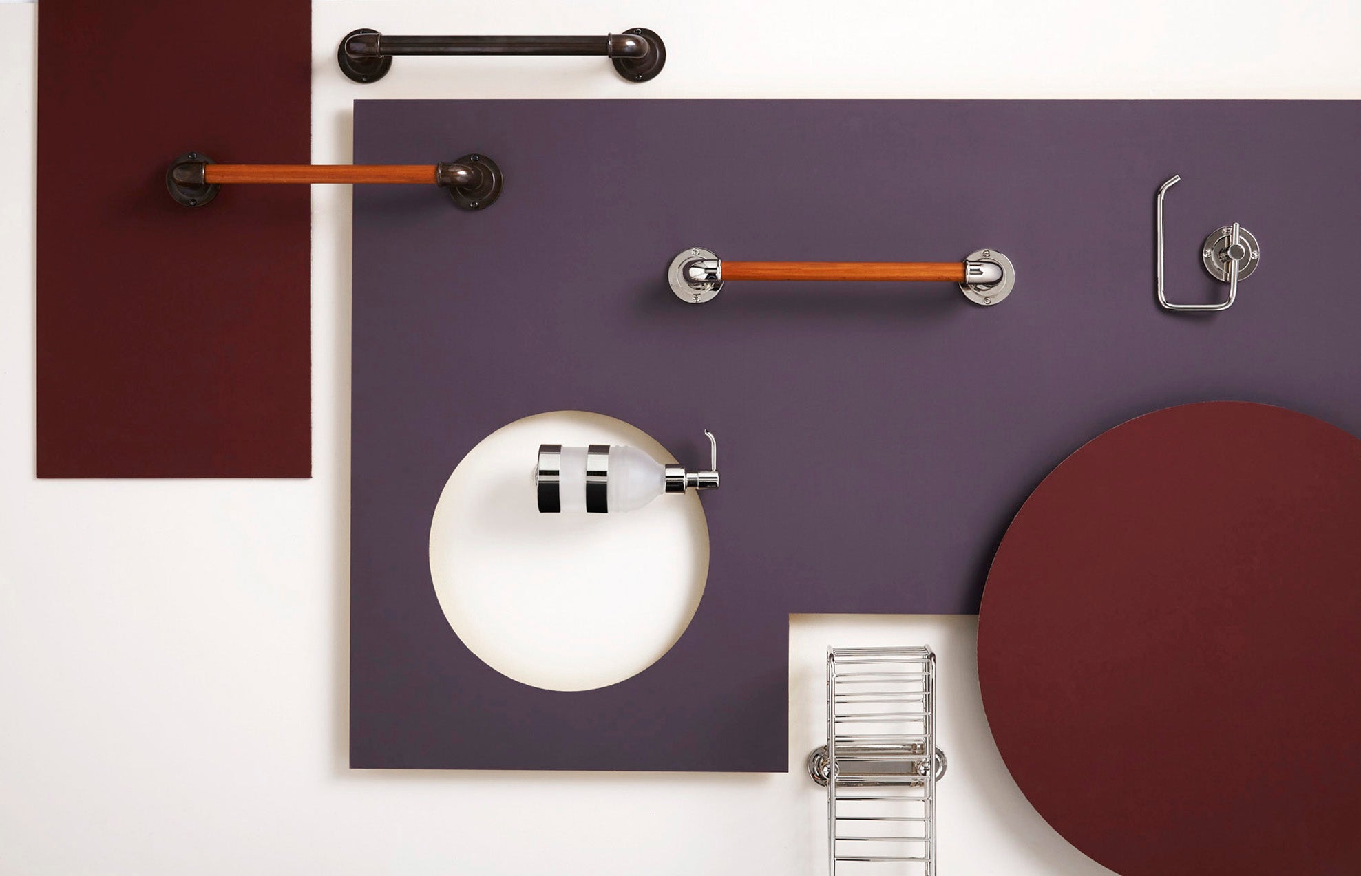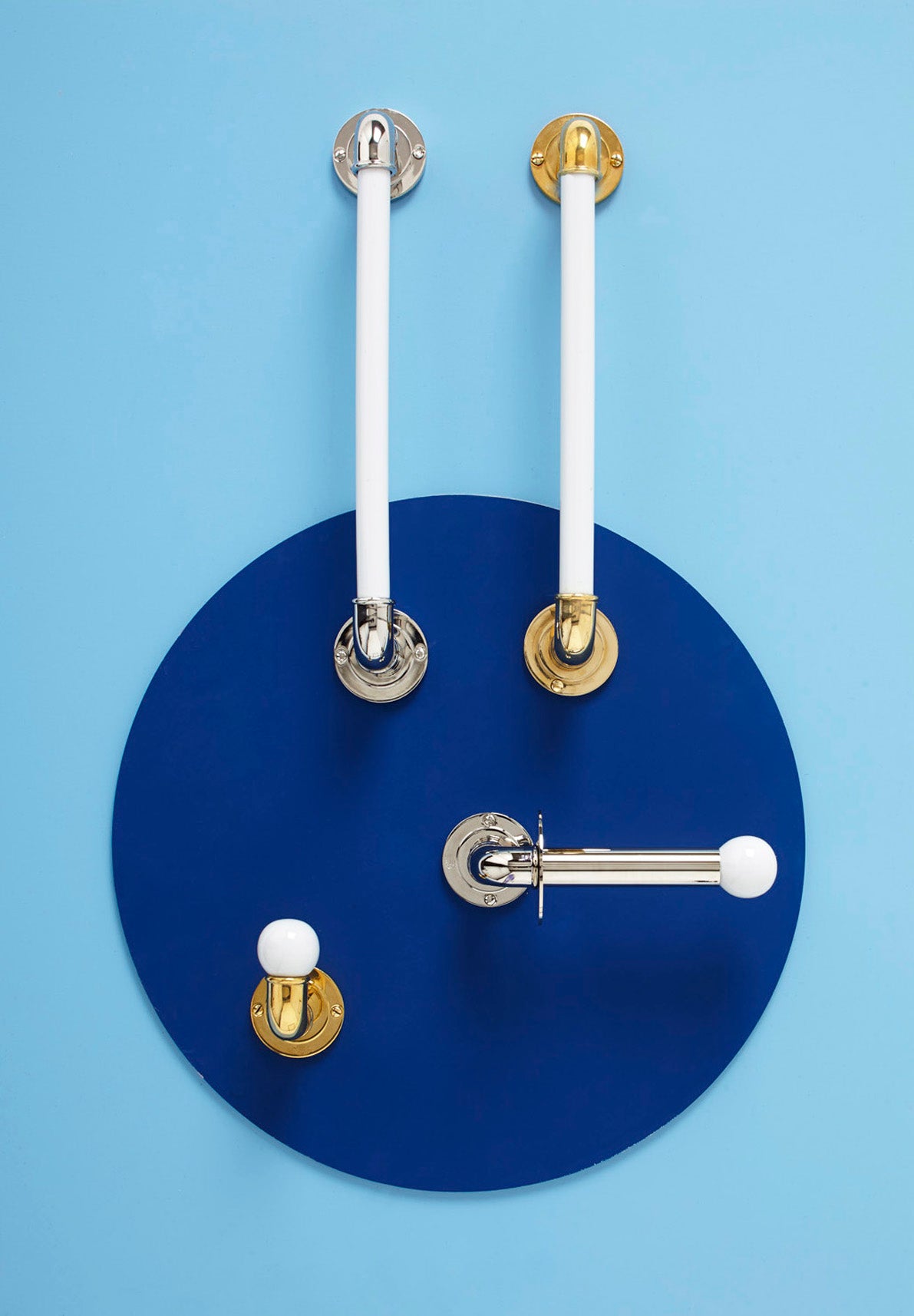 Modern utilitarian style characterizes the framework of this bent arm toilet roll holder. Available in multiple metal finishes, it features a handsome centre medallion and slightly curved end point to keep paper in place. Handcrafted in Europe.