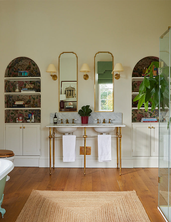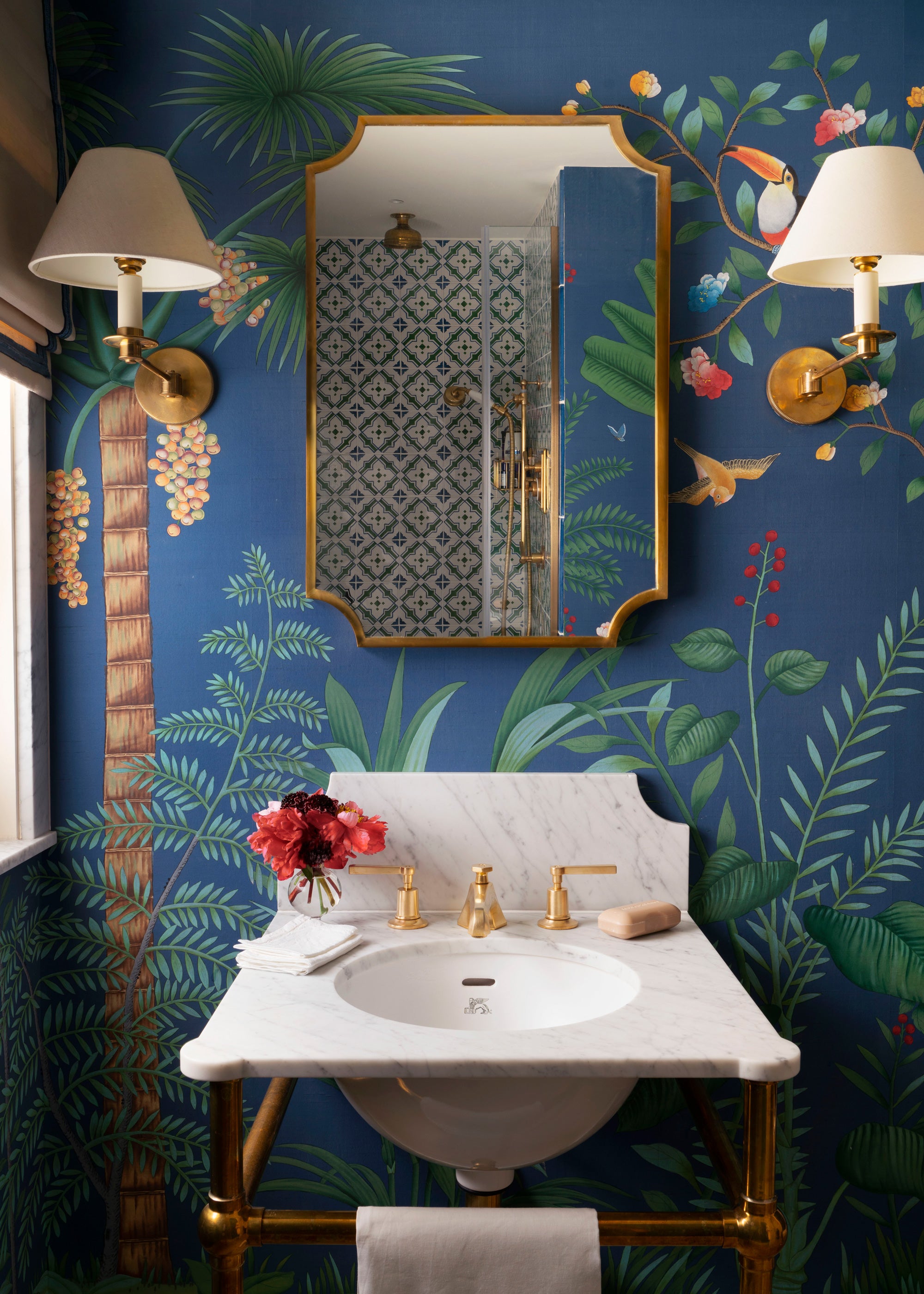 Single Gotham Washstand in Brass. Custom marble top supplied by client. Designer: Salvesen Graham. Wallpaper and photography courtesy of de Gournay.