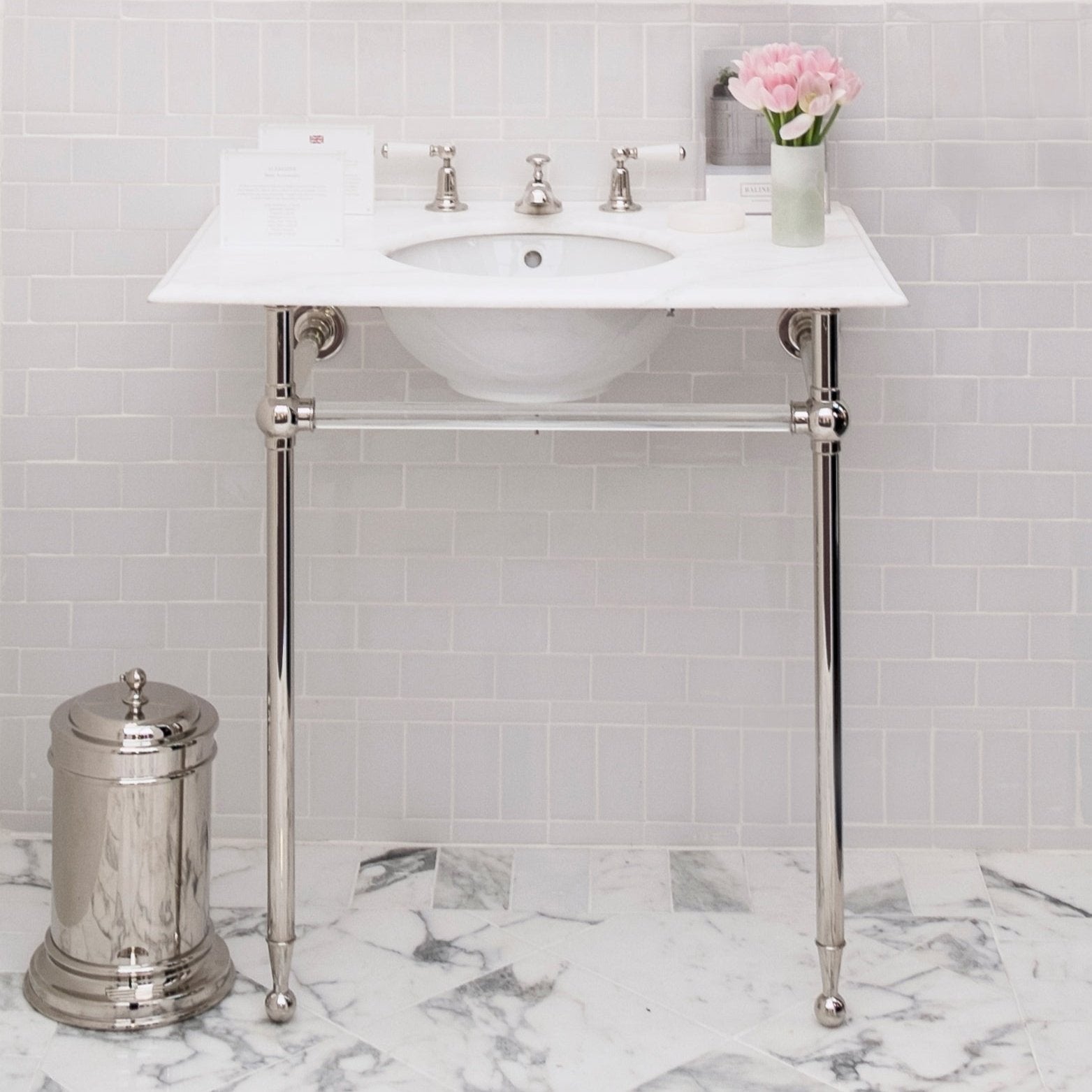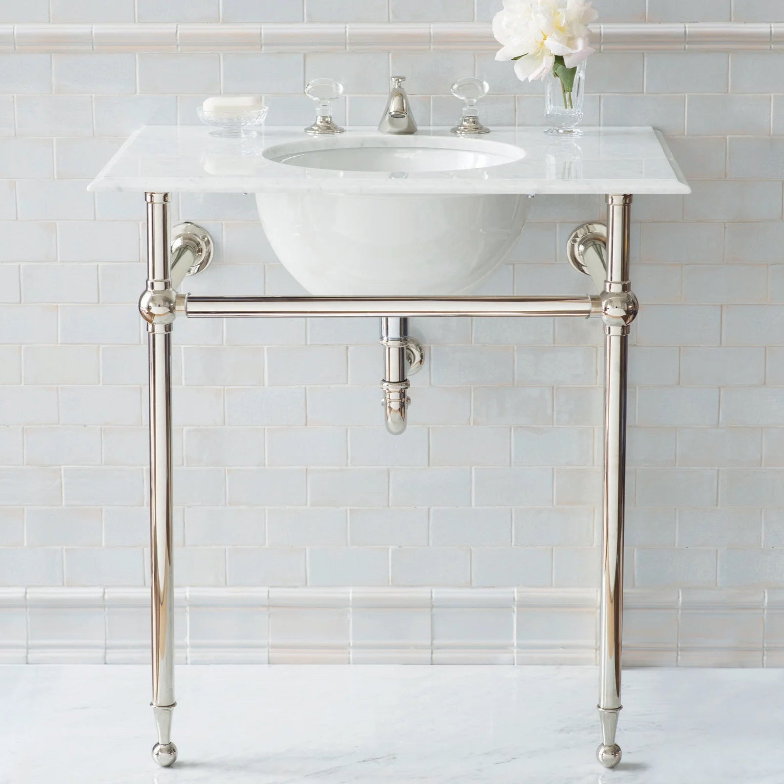 Graciously refined ball and taper legs with metal towel bars, give the Hanbury washstand an enduring elegance. The washstand is available in 2-leg single washstand (as shown) or 5-leg double washstand as standard, with other custom sizes and configurations available. All components are handmade in brass and available in a variety of finishes. Also available with glass towel bars. Please note: Marble and undermount basin are sold separately. Handcrafted in England.