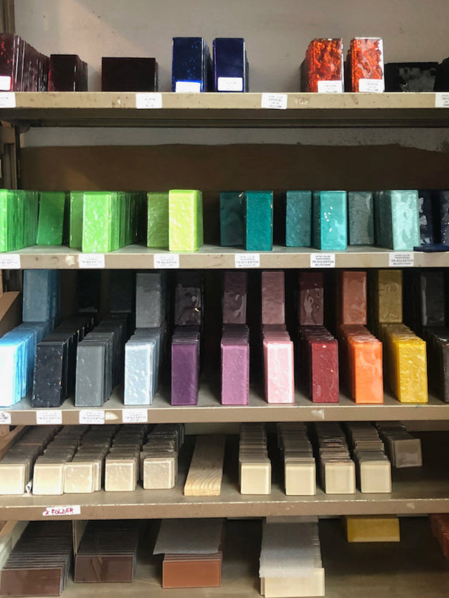 That process involves large sheets of glass which are sprayed with colour to a uniform finish and then scored by machine. Each tile is then carefully separated by hand and either re-fired or bevelled to smooth the edges, depending on the order.