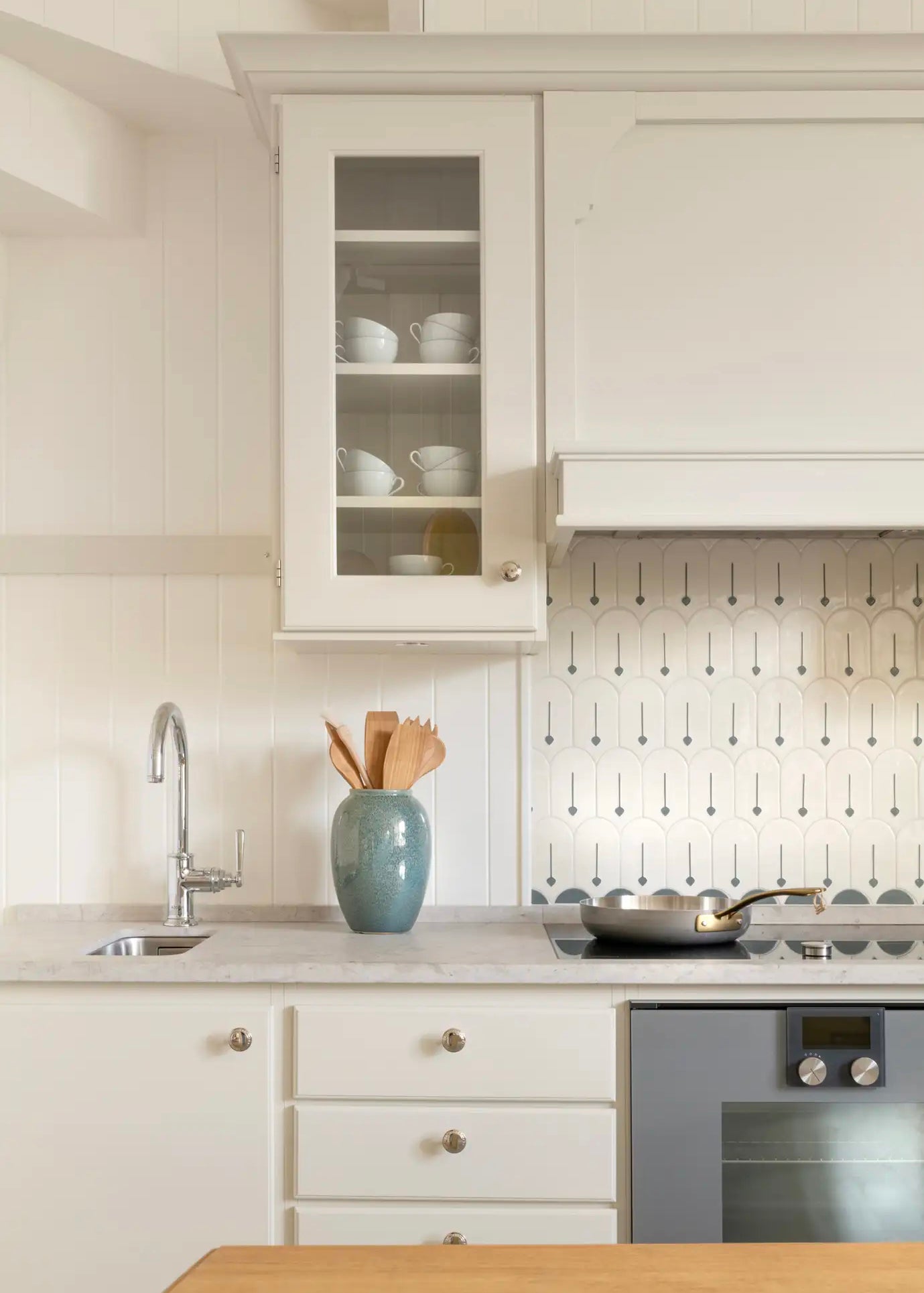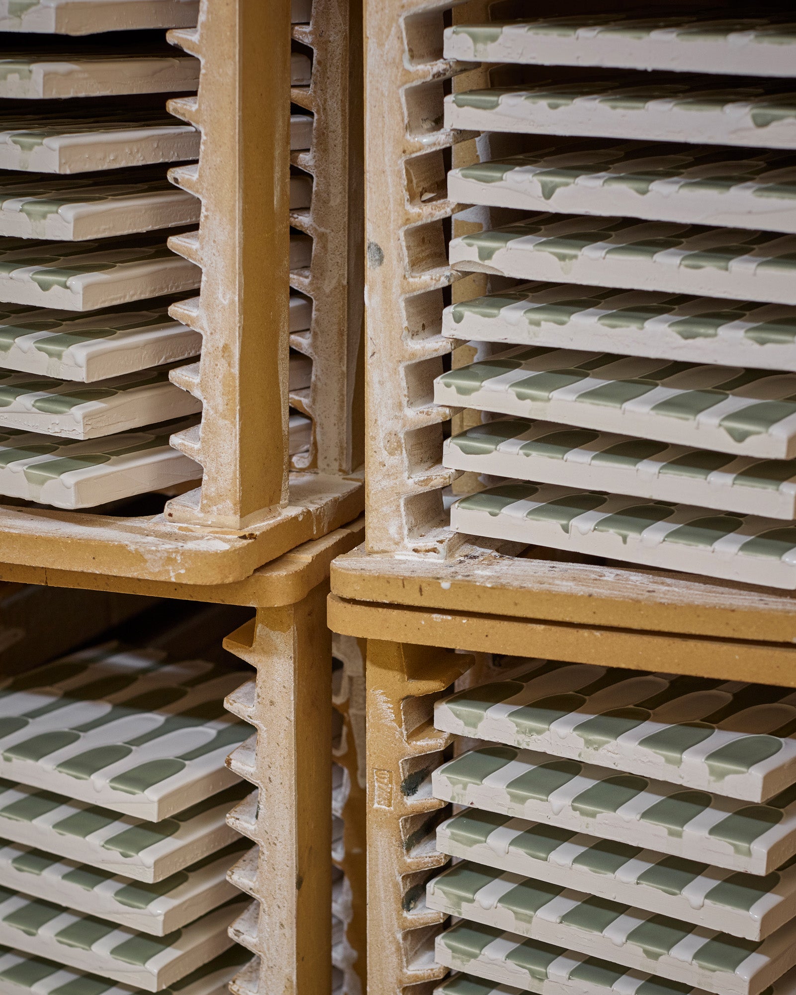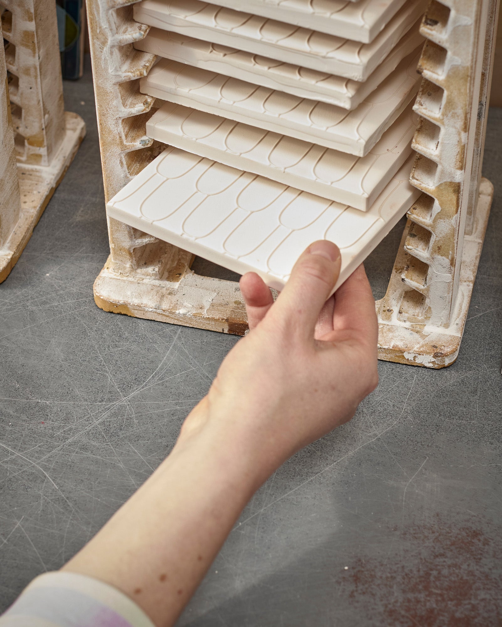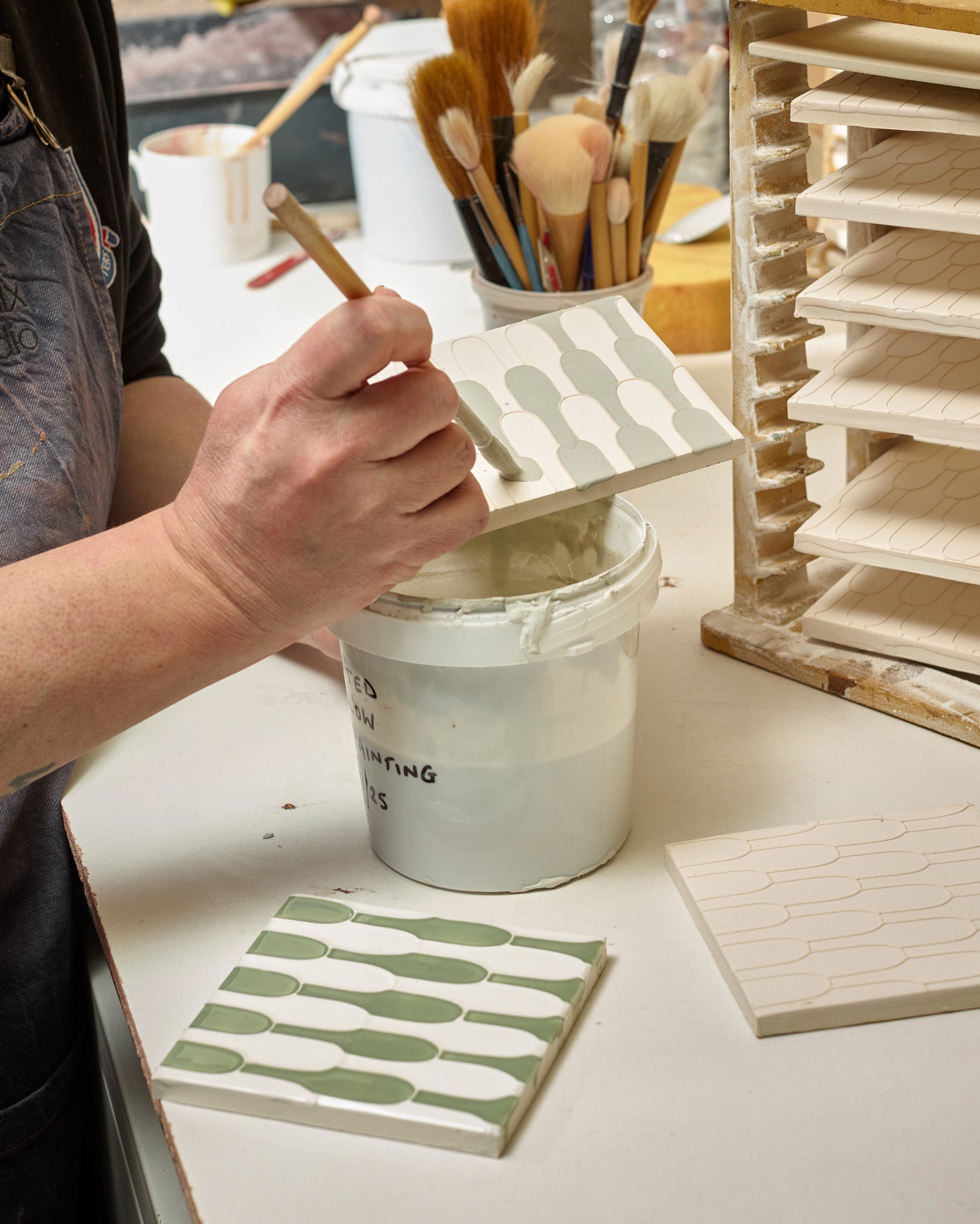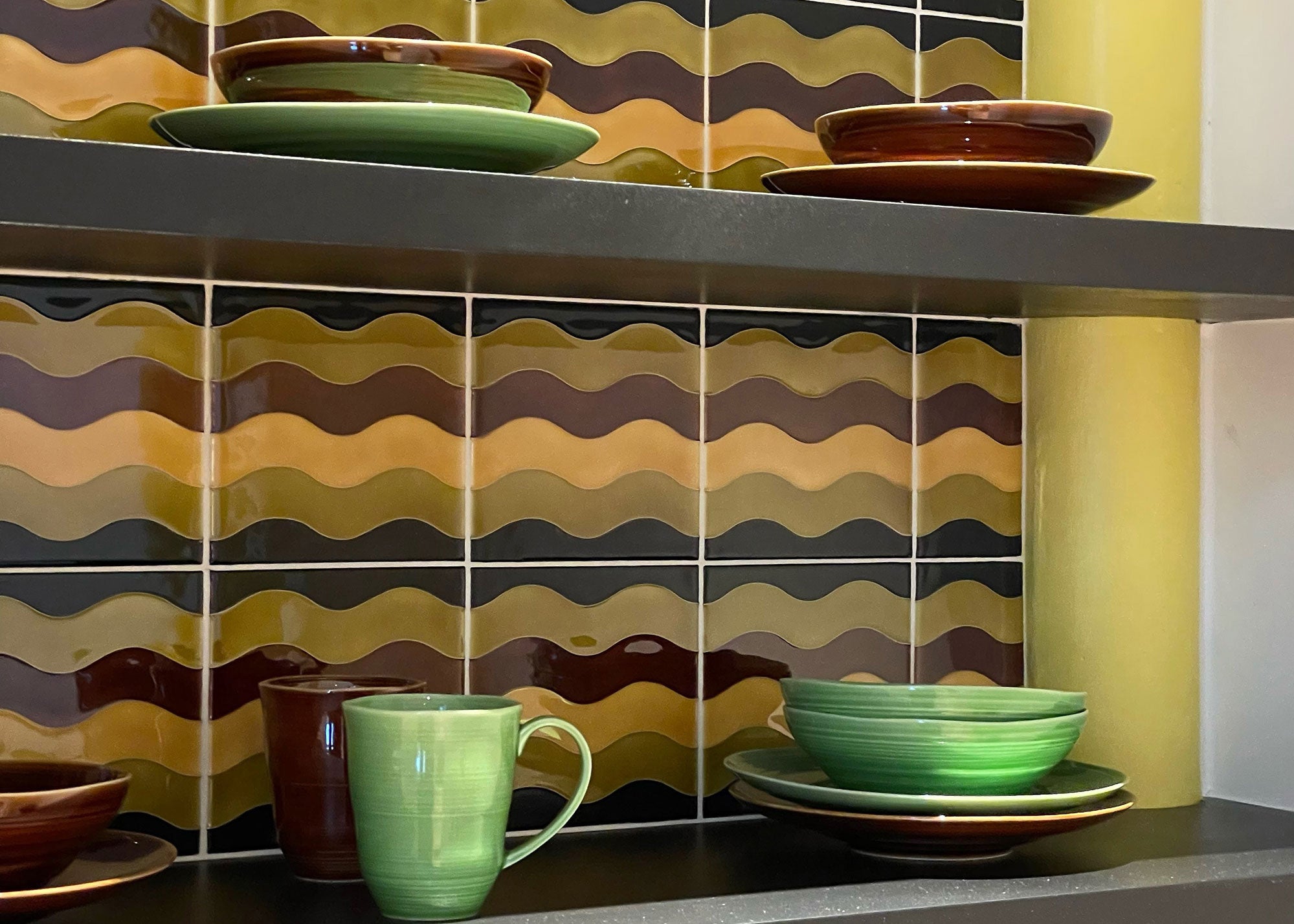 Designed to correspond with our Hanley Hand Cut tile shapes and glazes, they can be used as subtle inlaid border details or create bold, graphic full walls of pattern. Choose from our 5 core shapes and finishing edges with coordinating trims or rounded edges. Square and rectangular designs can also be produced on our Hanley Pressed tile bases, for those looking for more consistent grout lines.