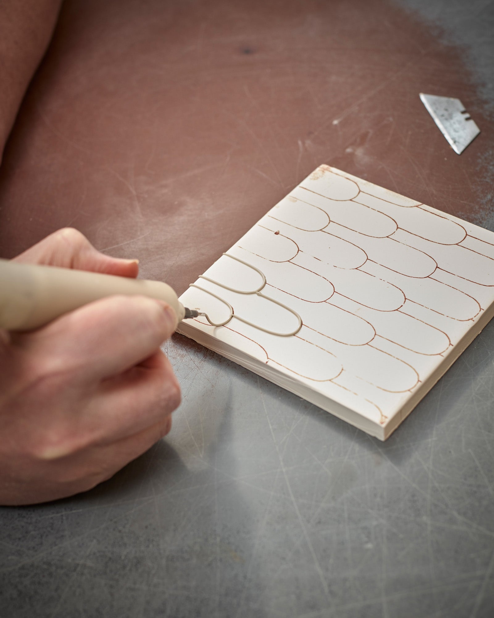 Crafted using a historical decoration technique called tube lining in Stoke-on-Trent, these handmade earthenware ceramic tiles are embellished with a raised piping detail.