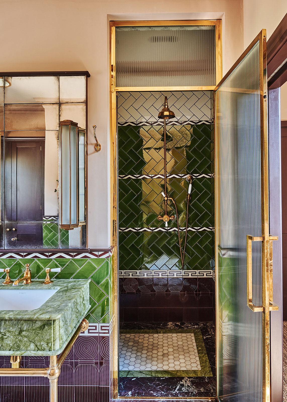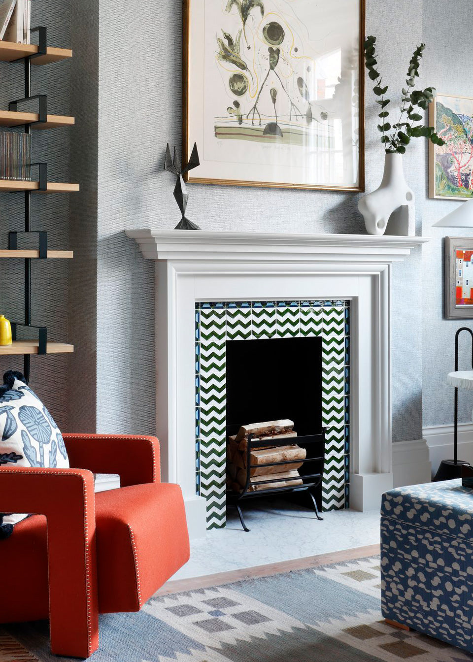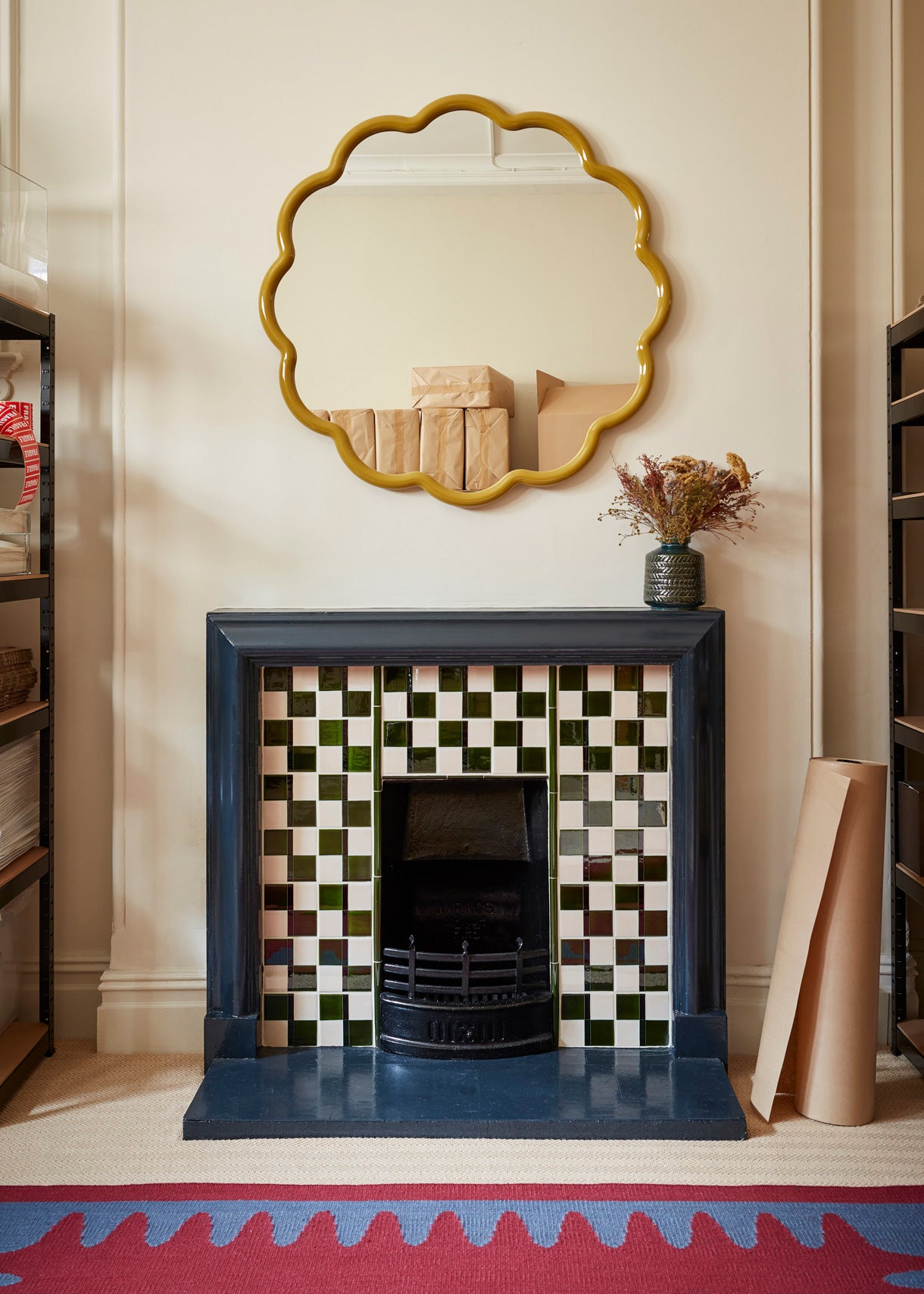 Balineum London Studio. Tube lined fireplace tiles and custom colour Flora Mirror Large.