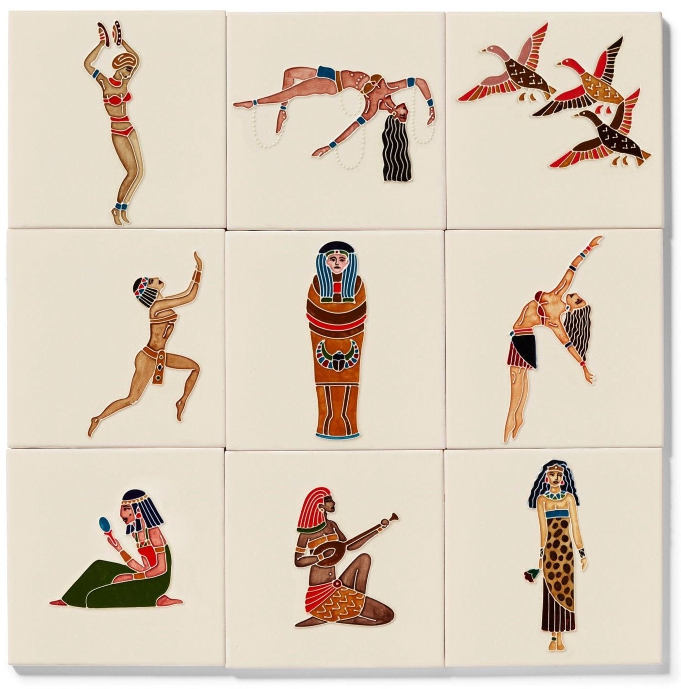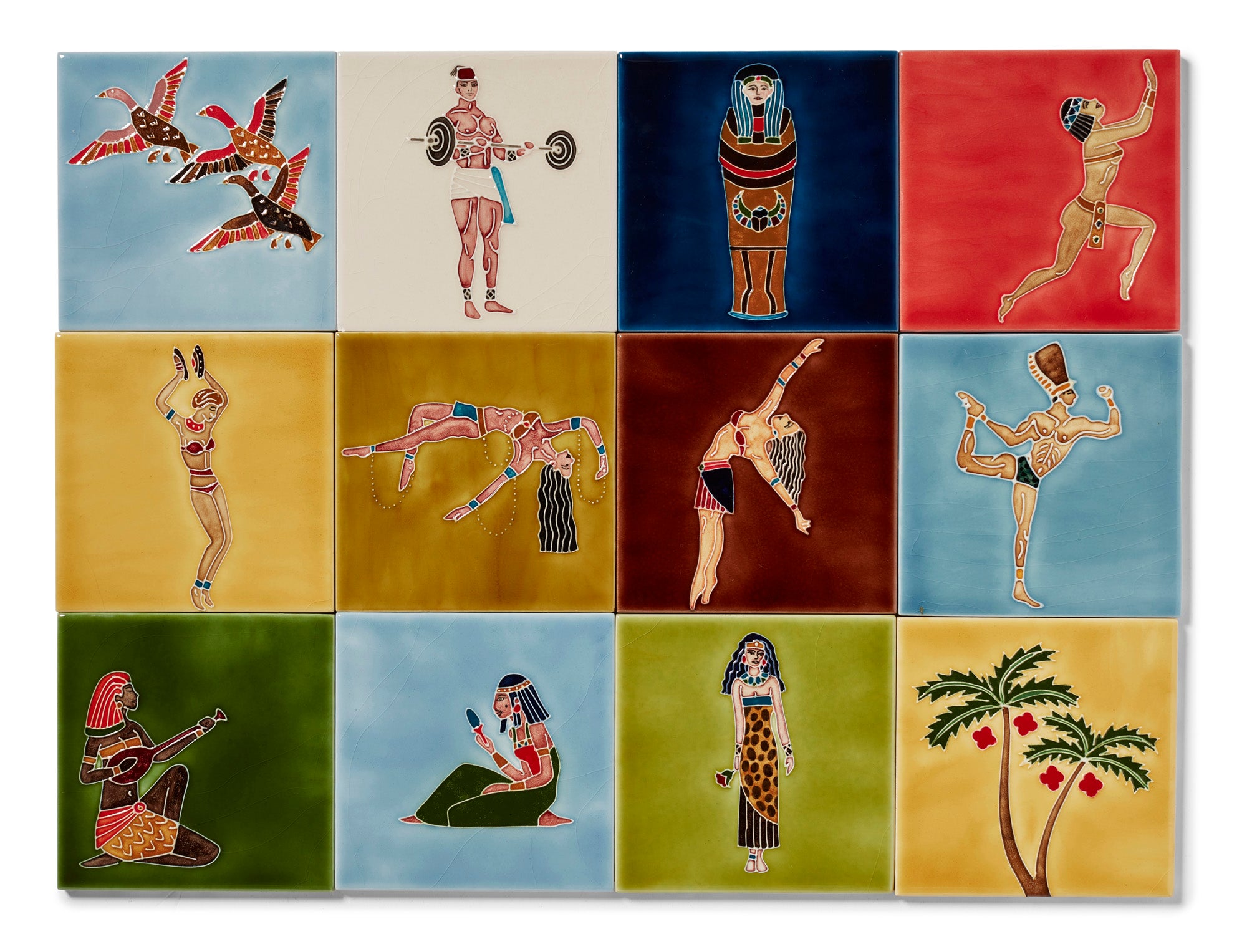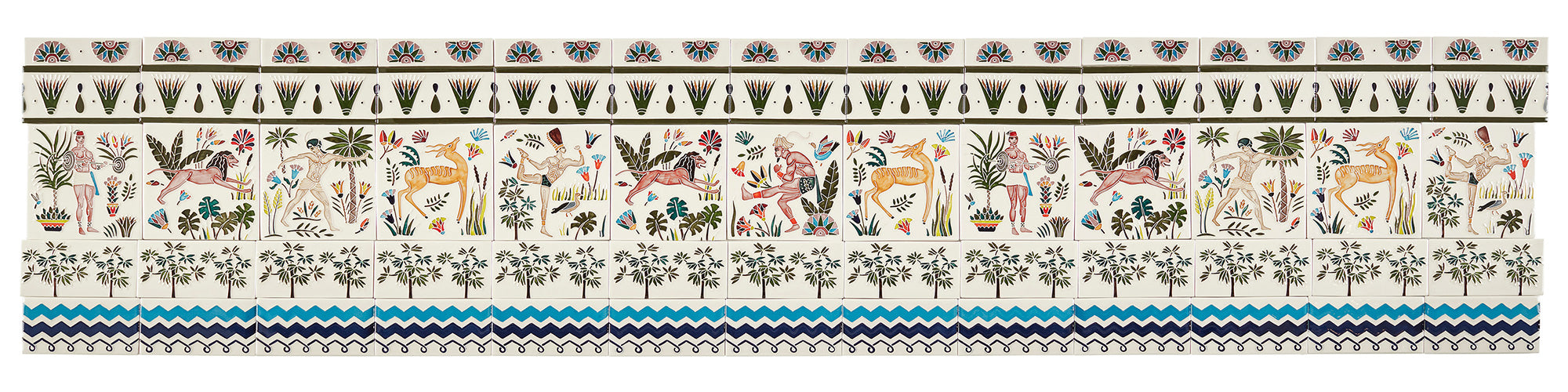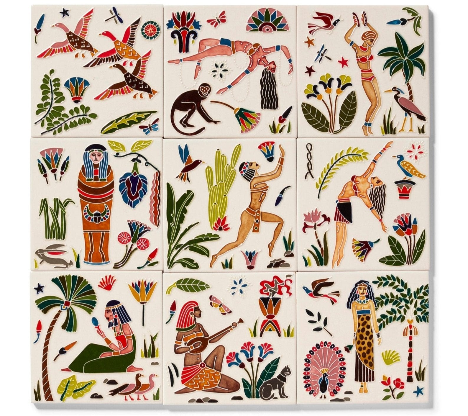In this joyful collection of handpainted ceramic tiles, French artist Louis Barthélemy captures the energy and vivacity of contemporary Egypt while paying homage to its storied past. Inspired by the ancient frescos and hieroglyphics lining Egyptian temples and tombs, along with the work of contemporary French photographer Denis Dailleux, Barthélemy evokes fantastical scenes of elegant figures, frolicking animals and naturalist motifs.