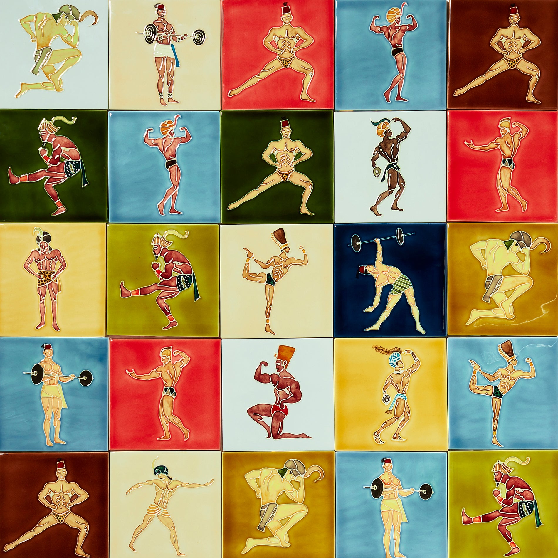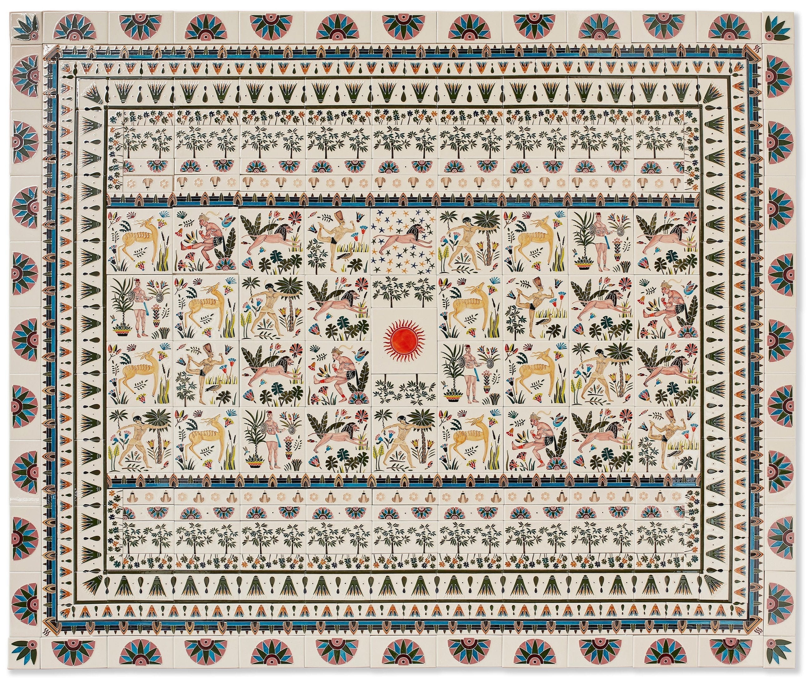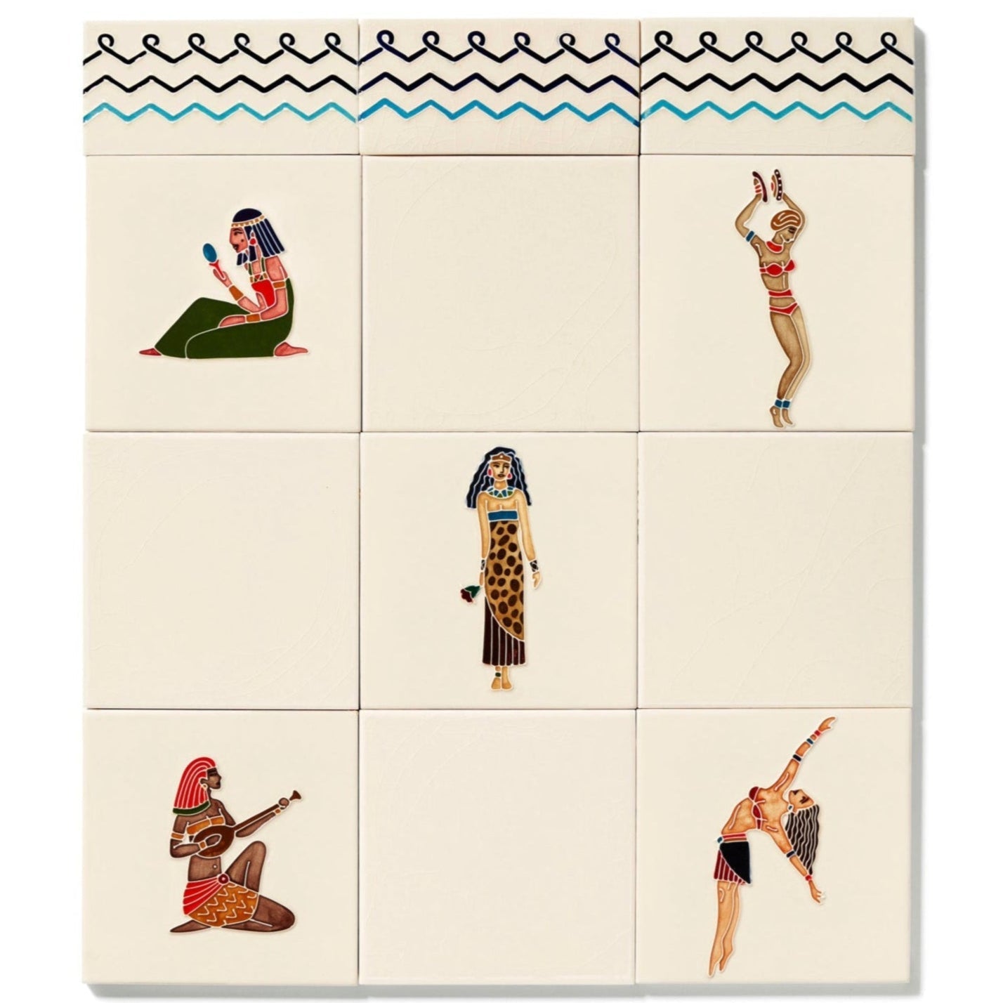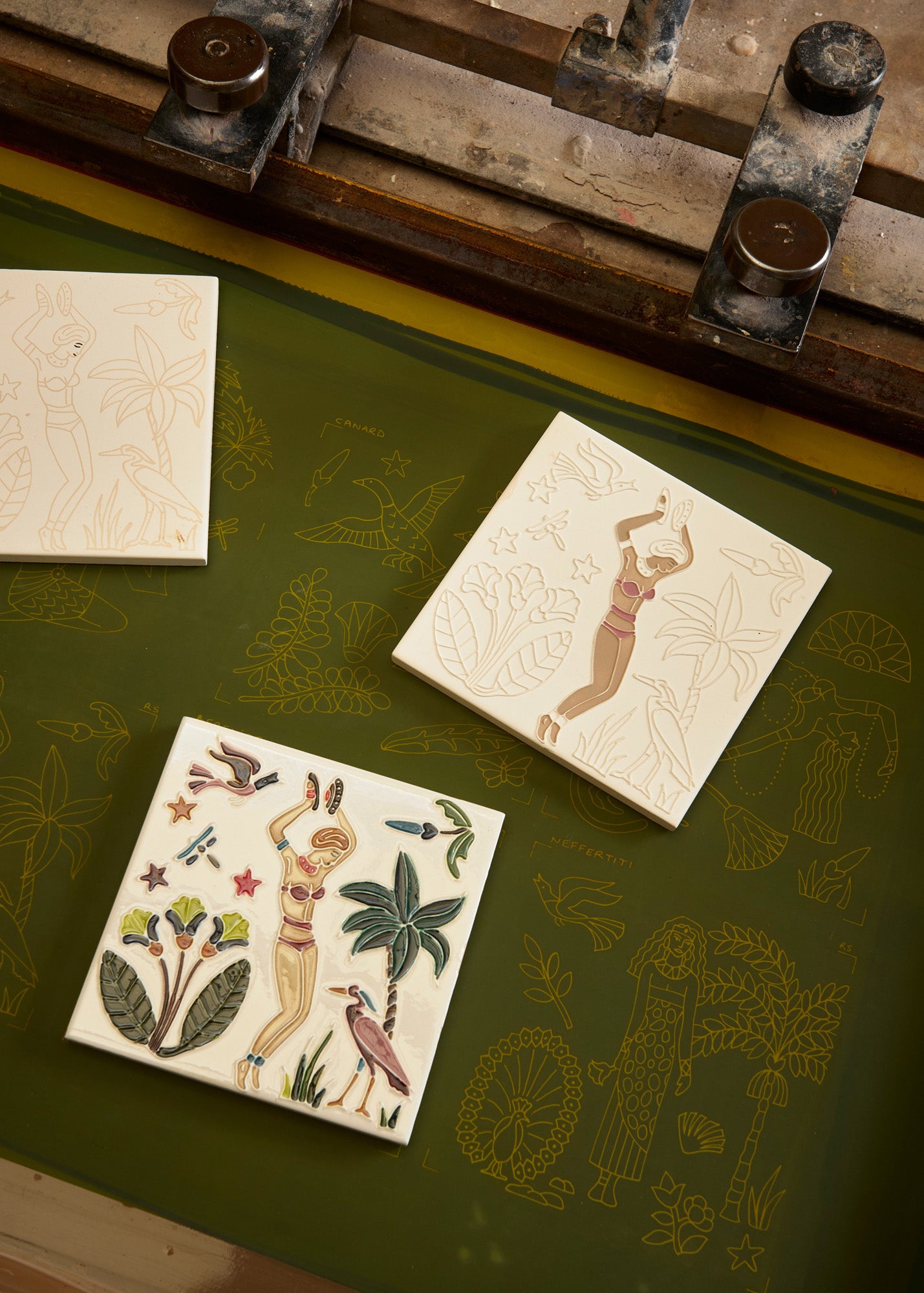 In this joyful collection of handpainted ceramic tiles, French artist Louis Barthélemy captures the energy and vivacity of contemporary Egypt while paying homage to its storied past. Inspired by the ancient frescos and hieroglyphics lining Egyptian temples and tombs, along with the work of contemporary French photographer Denis Dailleux, Barthélemy evokes fantastical scenes of elegant figures, frolicking animals and naturalist motifs.