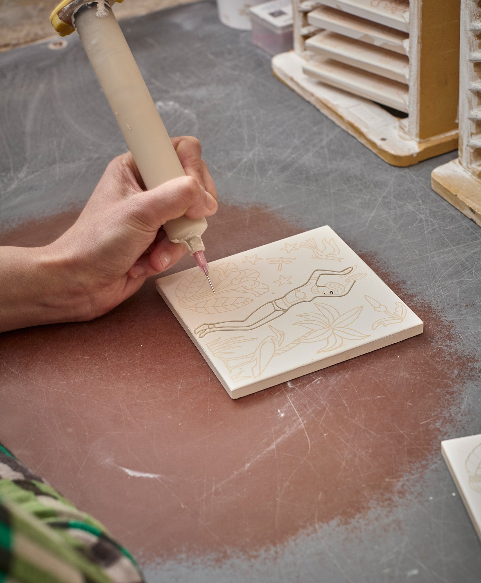The vegetable dye outline is then tube lined - a process where we apply a raised clay ridge to the tile surface. The tiles are fired again in the kiln to harden the clay ridge prior to being painted.