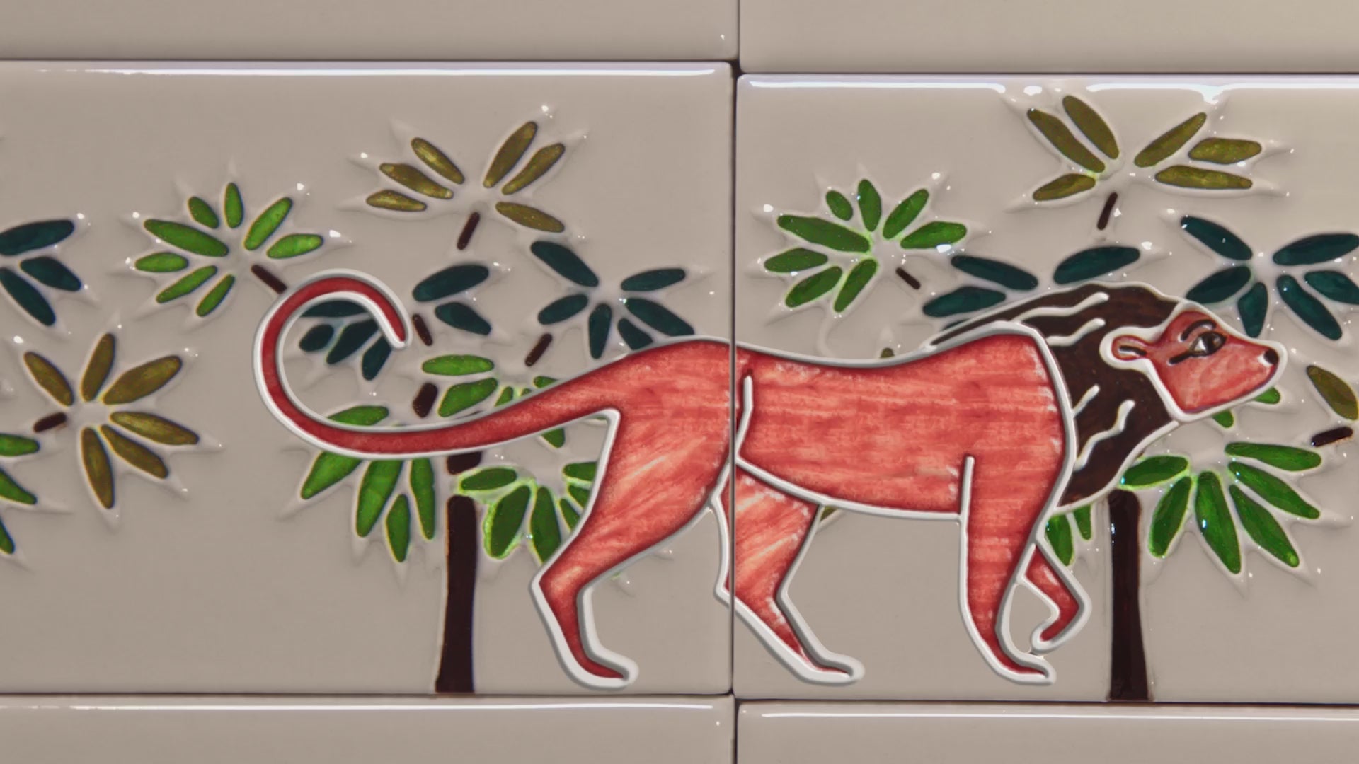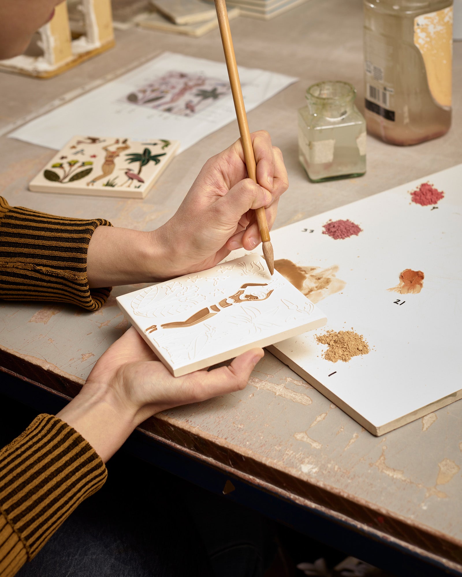 Each section is painted by hand prior to being scrapped to remove any excess glazes, sprayed with a transparent over glaze and then fired again. We use a mix of glazes and underglazes when making Louis tiles.
